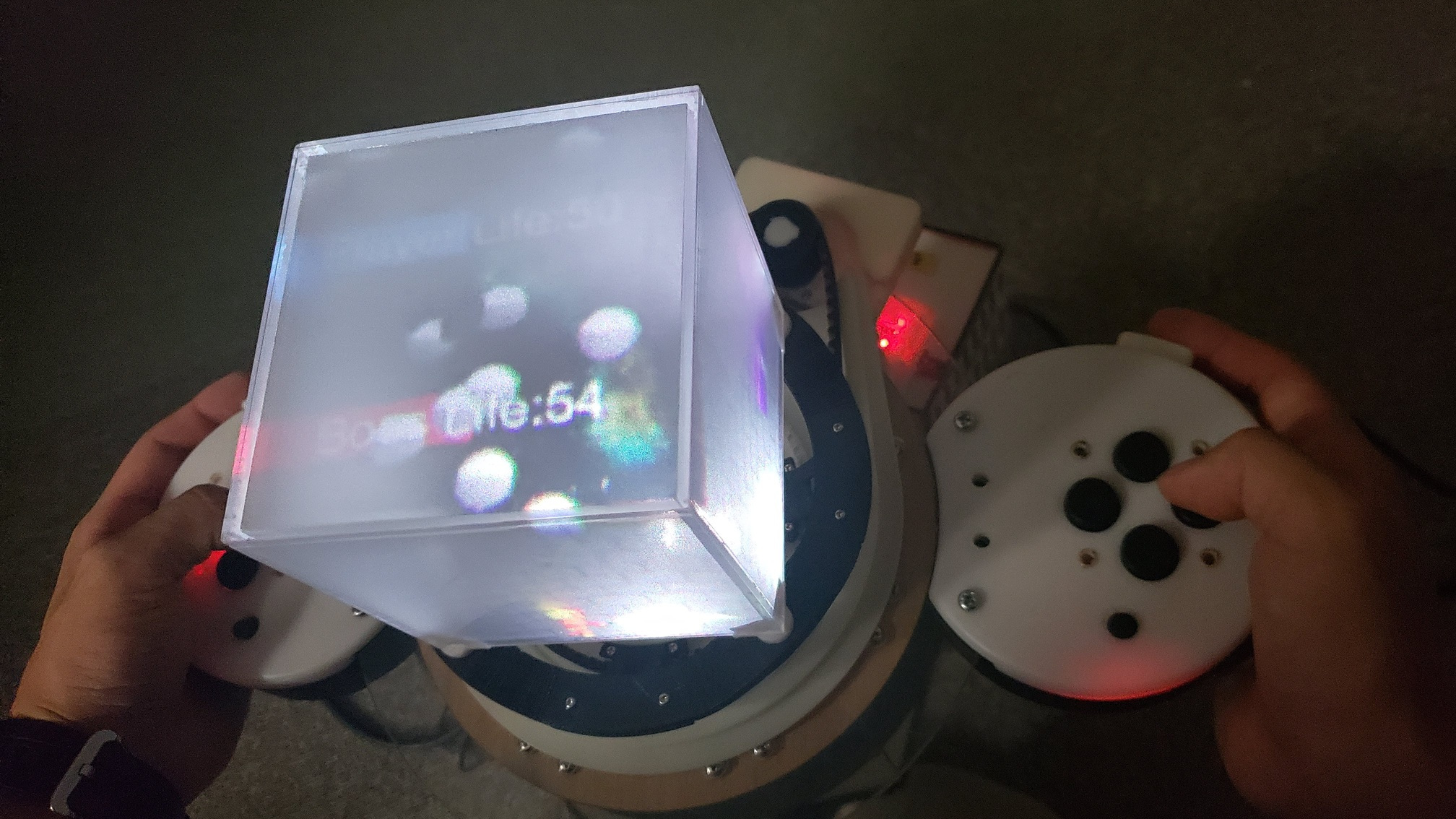 そこで我々は、これらのゲーム体験を実現する新しい独自のゲームデバイス”UPLIGHT”を開発した。UPLIGHTでは内蔵する小型プロジェクタと超広角魚眼レンズを用いた全周囲投影技術に加え、自由に取り換えることができる様々な形状の全周囲スクリーンにより、立体的で連続的なゲームコンテンツを実現した。さらに手や頭などの上半身を自由に動かすことでダイナミックに全周囲ディスプレイ上のゲームと対話することができる。